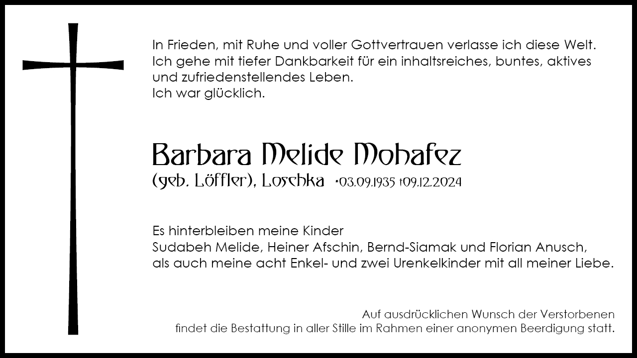 Barbara wurde am 14.01.2025 auf dem Parkfriedhof in Berlin Lichterfelde West beerdigt. Für die großzügige Hilfe und herzliche Unterstützung bei der Trauerfeier richten wir unsere tiefe Dankbarkeit an Herrn Pfarrer Büttner, SELK (Selbständige Evangelisch-Lutherische Kirche).